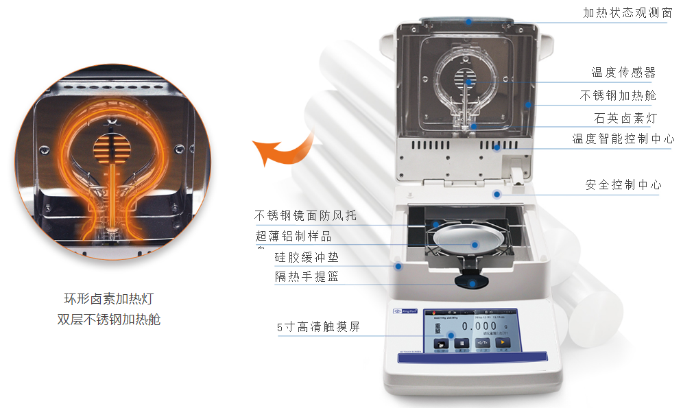 PY-E628T触屏式卤素快速水分测定仪,又名回潮率快速水分仪,采用卤素灯热解重量原理快速测试试样水分含量,只需几分钟即可完成水分测试。显示部分采用液晶显示屏示值清晰可见,分别显示水分值,样品数值,测定时间,温度初值等数据,与国际烘箱加热法相比,卤素加热可以在高温下将样品均匀地快速干燥,样品表面不易受损,其检测结果与国标烘箱法具有良好的一致性,具有可替代性,且检测效率远远高于烘箱法。