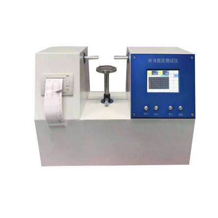 测试原理:把试样杯放在挺度测定仪的活动台架上,使传感器测头刚好垂直接触到杯的侧壁,调节活动台架使测头与杯底的垂直距离约为杯高的三分之二处。向前移动一定距离后仪器自动录纸杯挺度值。