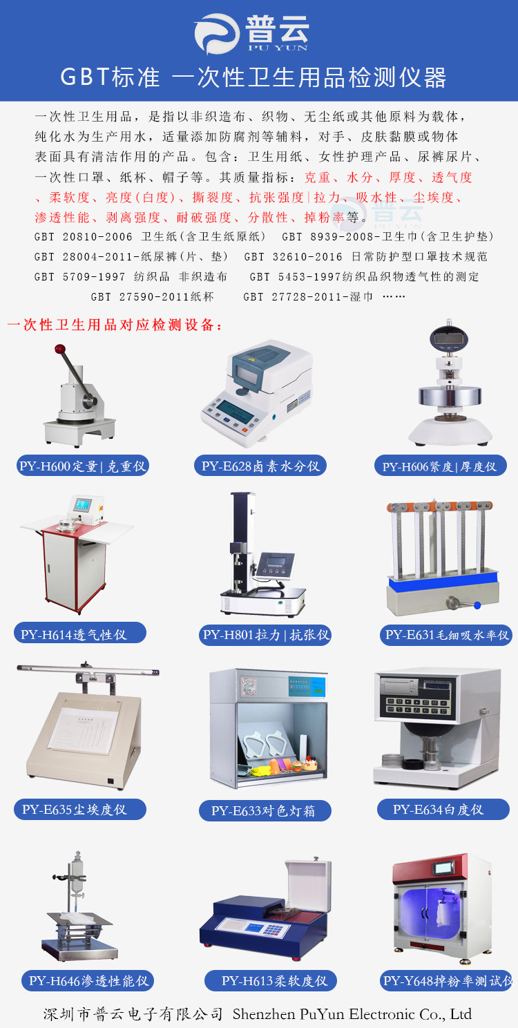 白度、平滑度、光泽度、柔软度、荧光剂、漂白剂、尘埃度、厚度、pH值、渗漏性能、抗张强度、层间结合强度、横向吸液高度、撕裂度、重金属、微生物指标、环保检测、有害物质检测等。