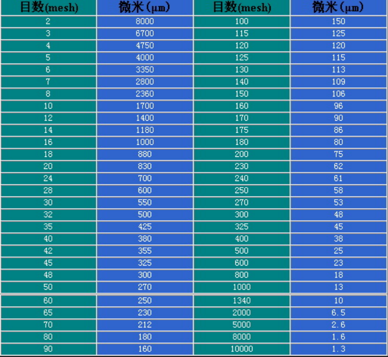 10目、14目、28目、30目、40目、60目、80目、100目、200目、300目、400目、500目、1000目、3000目,根据具体的功能纤维特性进行选配,必须通过实验进行网目选择确定